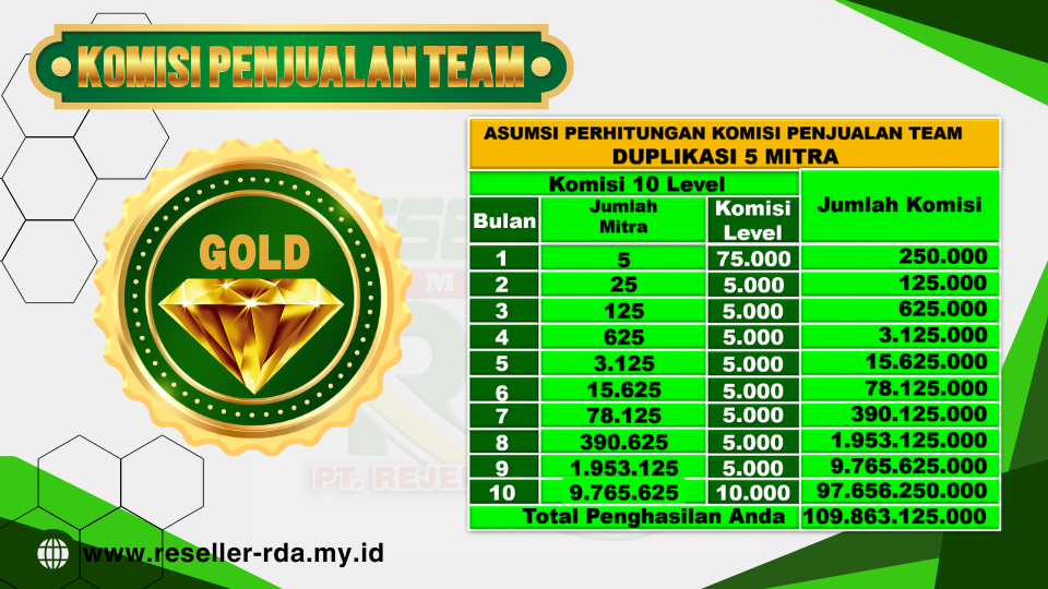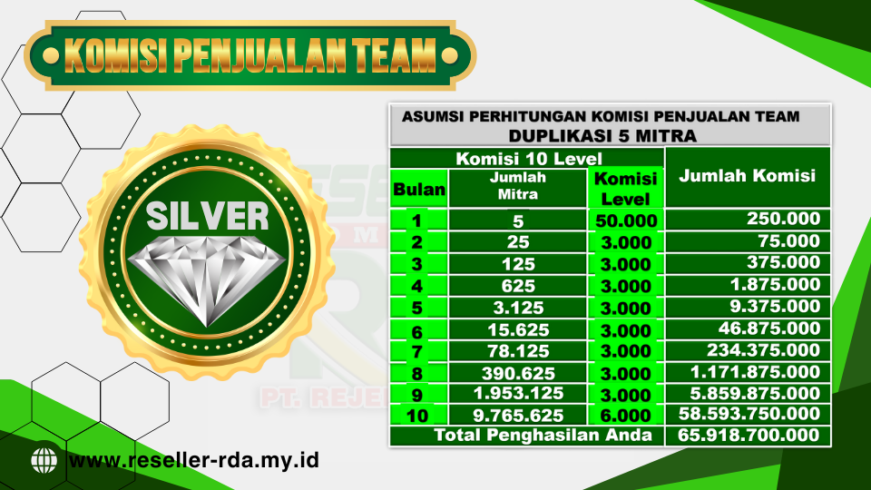 Maka kunci sukses di bisnis ini adalah bekerja membangun team dengan duplikasi minimal 5 orang saja. berikut tabel perhitungan komisi penjualan team baik paket Silver maupun Gold :